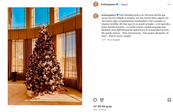 Con ironía escribió: “Feliz Navidad tarde a mi hermosa familia que nunca me han faltado el respeto, me han hecho daño o alguna vez han hecho algo completamente inaceptable o han causado un trauma increíble, del tipo que no se puede arreglar... a mi querida y dulce familia inocente... Lo siento mucho, estaba ocupada esta Navidad, pero definitivamente apareceré y los sorprenderé pronto... No puedo esperar... Hola, hermosa Ivy... Solo quiero abrazarte, mi amor... Buena suerte, amigos”.
