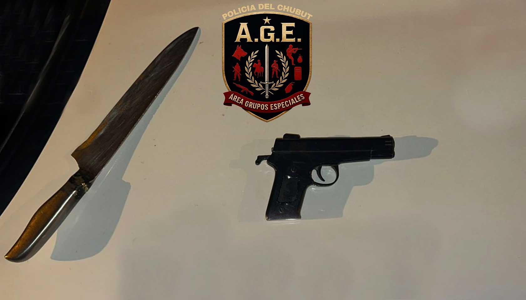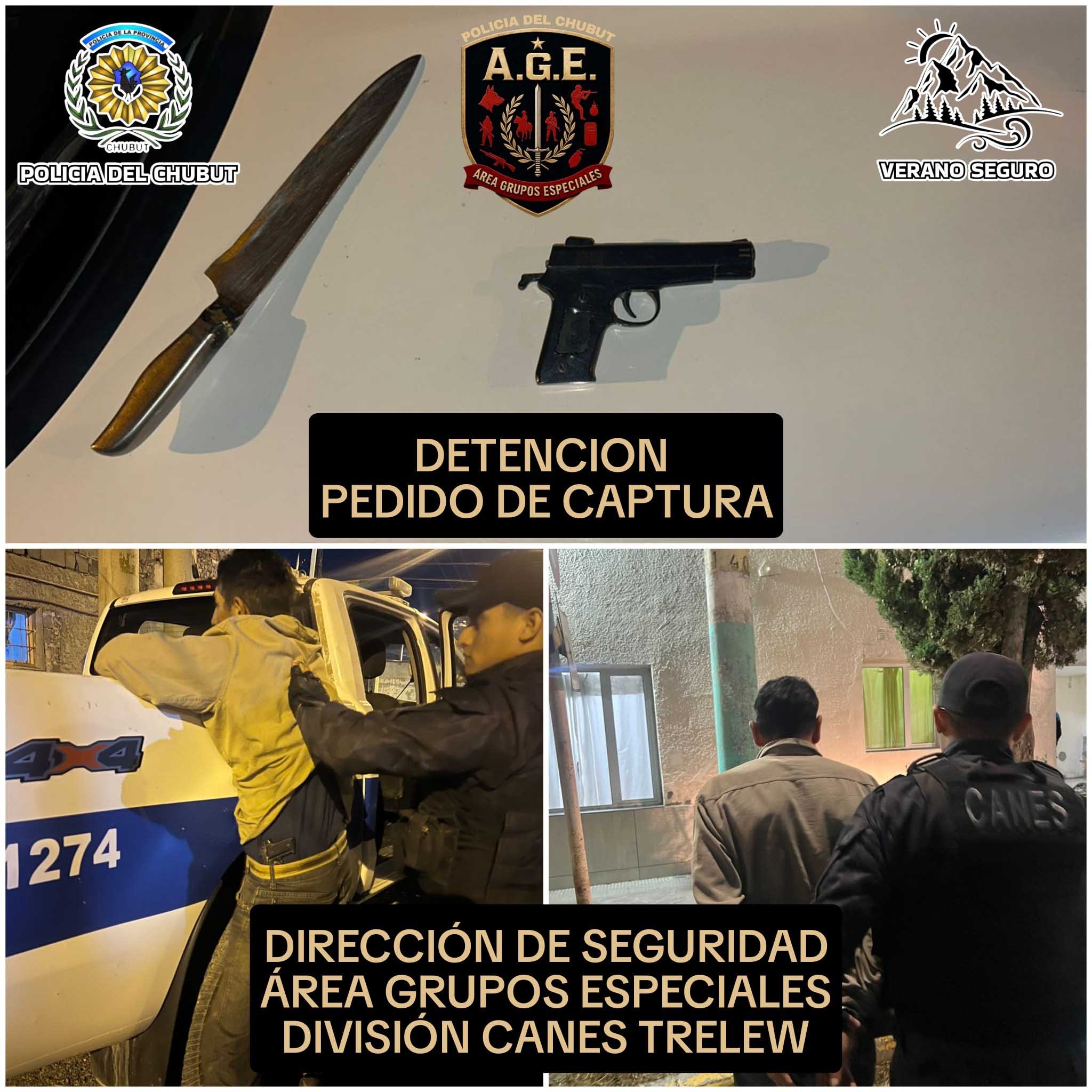 Cerca de la 01:30 h de este domingo, personal de Canes Trelew, que realizaba tareas de patrullaje preventivo, recibió una alerta radial del Comando Radioeléctrico informando que sobre calle Los Alerces, frente a las Mil Viviendas, se encontraba una pareja discutiendo acaloradamente y que el hombre tendría un arma de fuego consigo mismo.