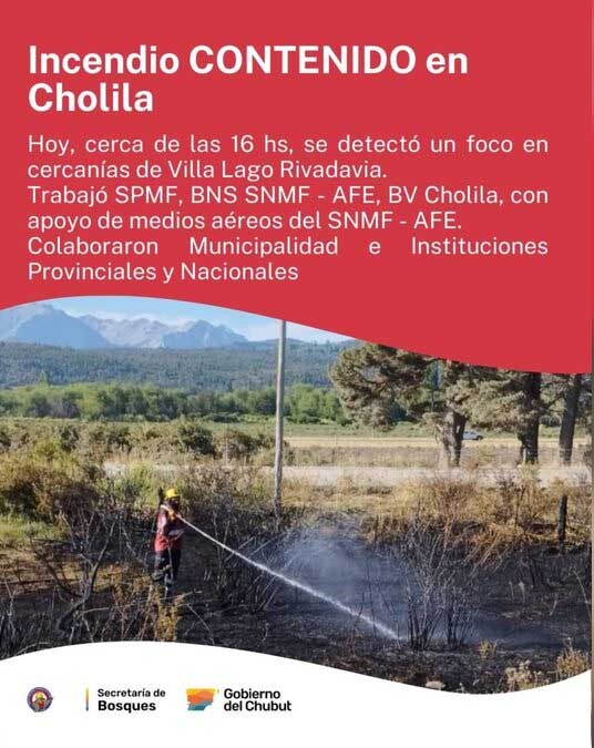 El incendio forestal que afectó el domingo campos en cercanías de Villa Lago Rivadavia, en Cholila, fue contenido cerca de la medianoche de ese día luego de horas de lucha por parte de los brigadistas.