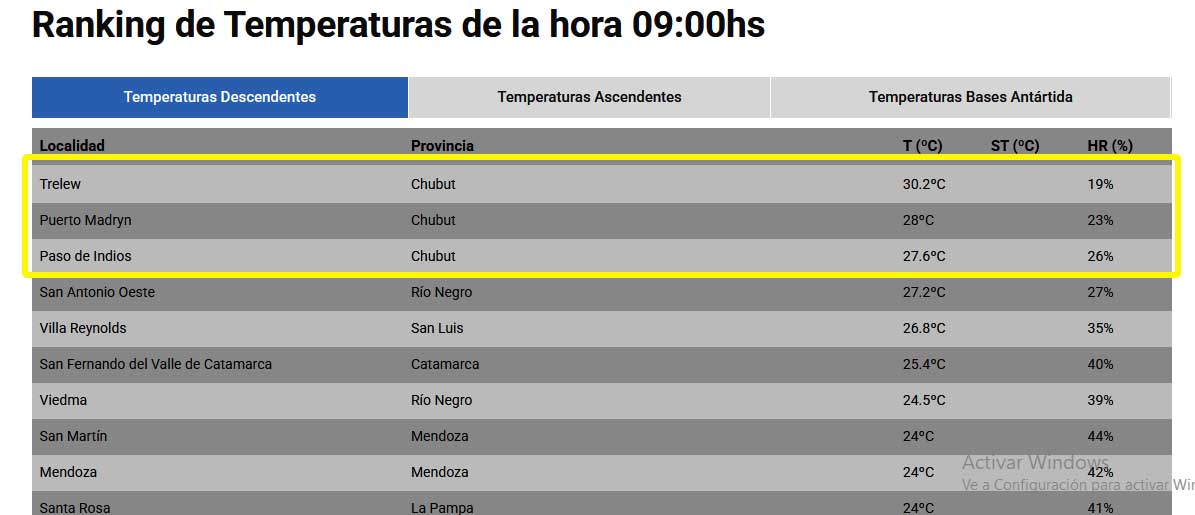 Desde el portal del Servicio Meteorológico Nacional se informó el ranking de las ciudades más calurosas del país de este lunes a las 09:00 h de la mañana.