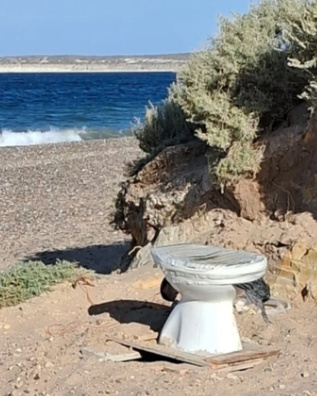 En la imagen se puede observar al inodoro colocado sobre unas maderas y de fondo la imagen del Golfo Nuevo. El sector es playa Káiser y es uno de los puntos escogidos por numerosos vecinos que se acercan para acampar o instalarse con sus casillas y motorhome.
