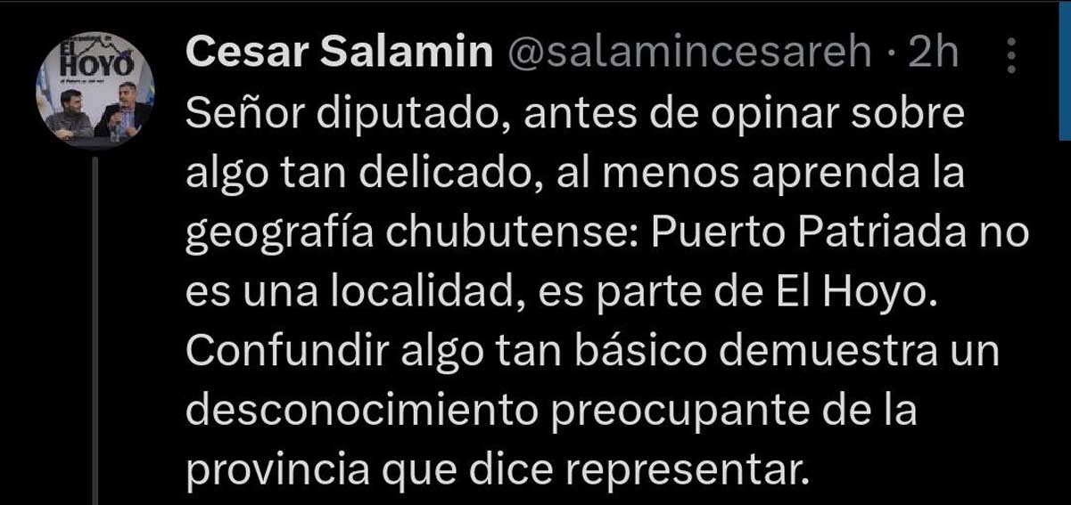 Semejante metida de pata, no solo indignó a los pobladores, sino que también al intendente de El Hoyo, César Salamín, que no dejó pasar el momento para “atender” en las redes al diputado nacional y pedirle que vuelva a la escuela.