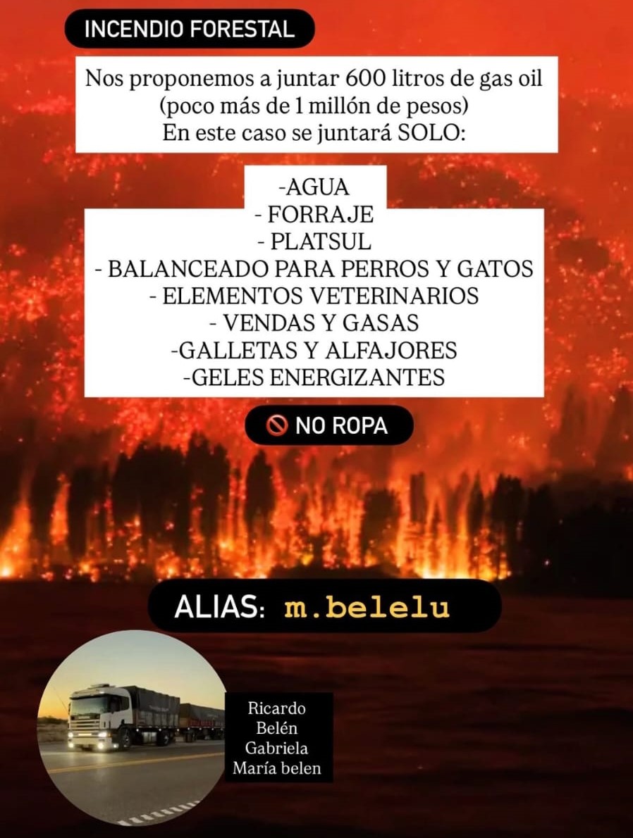 En el marco del incendio forestal que afecta a Puerto Patriada, un grupo de vecinos de Trelew impulsa una colecta solidaria para colaborar con la comunidad y con quienes trabajan en el combate del fuego.