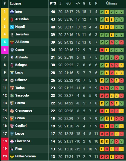 Ya sin partidos pendientes, el certamen continuará este viernes con la fecha 21. Milan volverá a jugar el domingo, de local, contra Lecce, y Como lo hará el lunes, de visitante, ante Lazio. El puntero Inter visitará el sábado a Udinese.