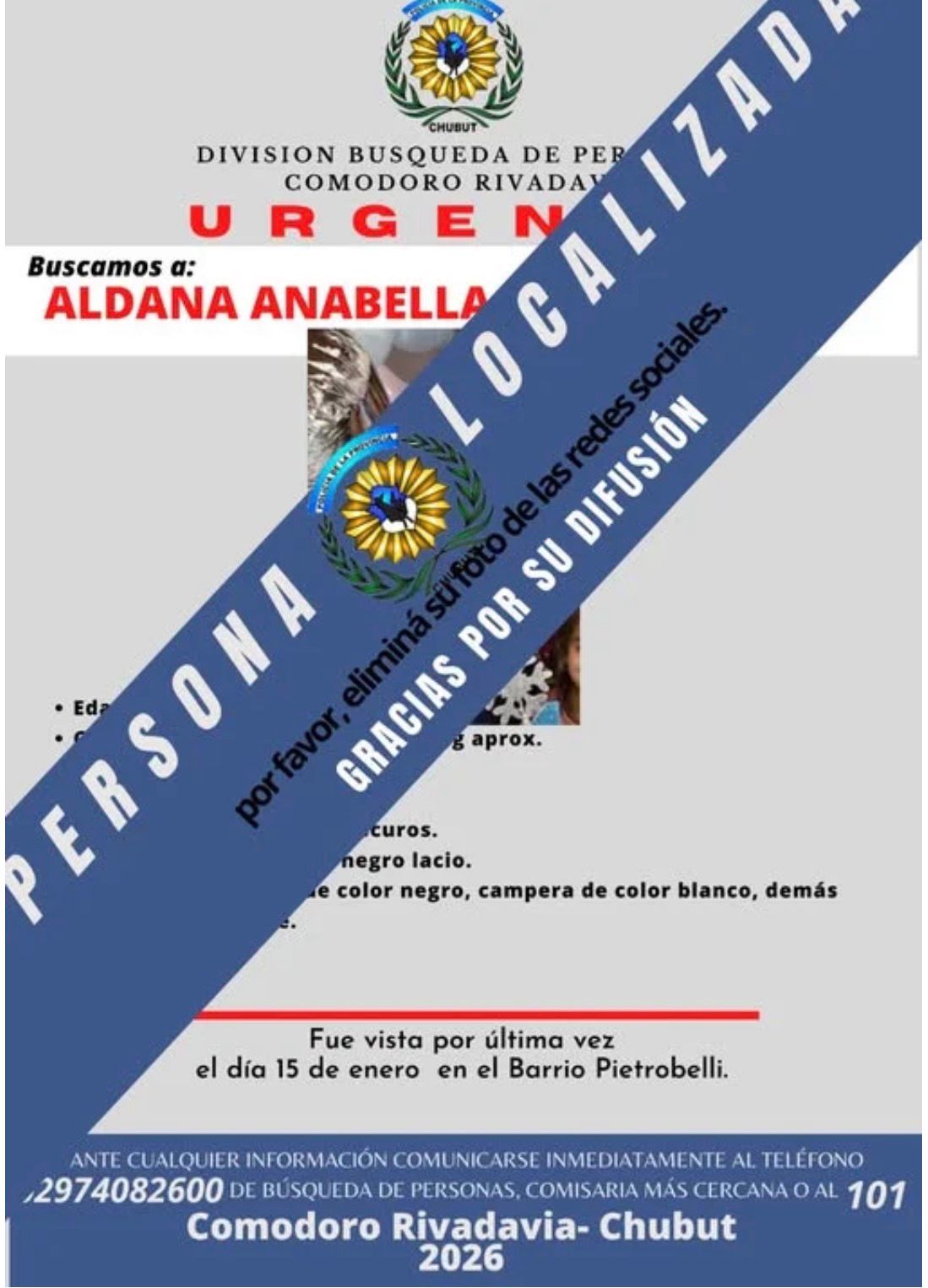 La División Búsqueda de Personas de la ciudad de Comodoro Rivadavia, solicita que se deje de difundir la imagen de la mujer buscada en Comodoro Rivadavia este viernes, ya que apareció.