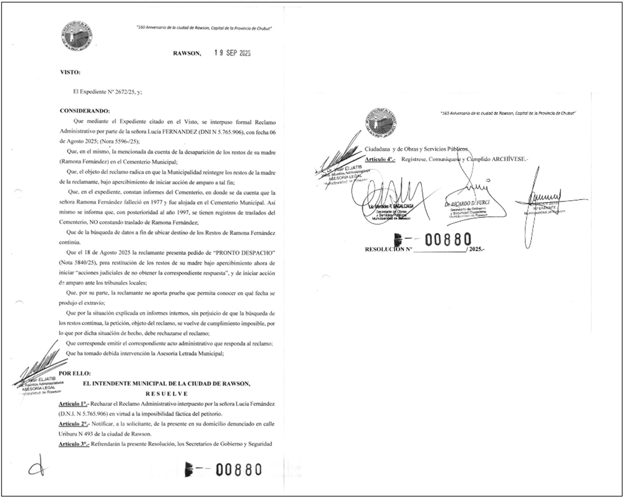 En una resolución de la Municipalidad de Rawson firmada por el propio intendente Biss, el secretario de Gobierno y Seguridad Ciudadana, Ricardo Furci, y la secretaria de Obras Públicas, Mercedes Bagalciaga, se le reconoció a Lucía Fernández, hija de Ramona Fernández (fallecida y enterrada en el Cementerio capitalino en 1977) que no tenían ni idea dónde estaban los restos de su madre.