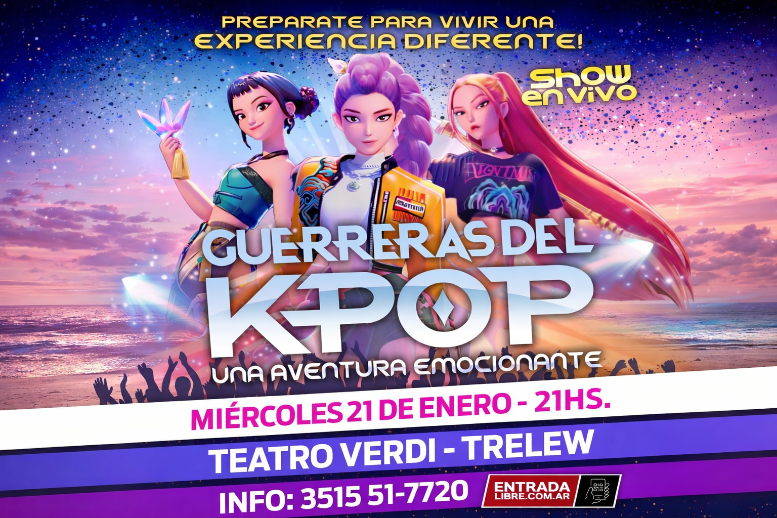 Este miércoles 21 de enero a las 21 horas, el Teatro Verdi de Trelew será escenario de un evento imperdible para grandes y chicos: Las Guerreras del K-pop: una aventura emocionante, un espectáculo que combina música, baile y una experiencia interactiva pensada para toda la familia.