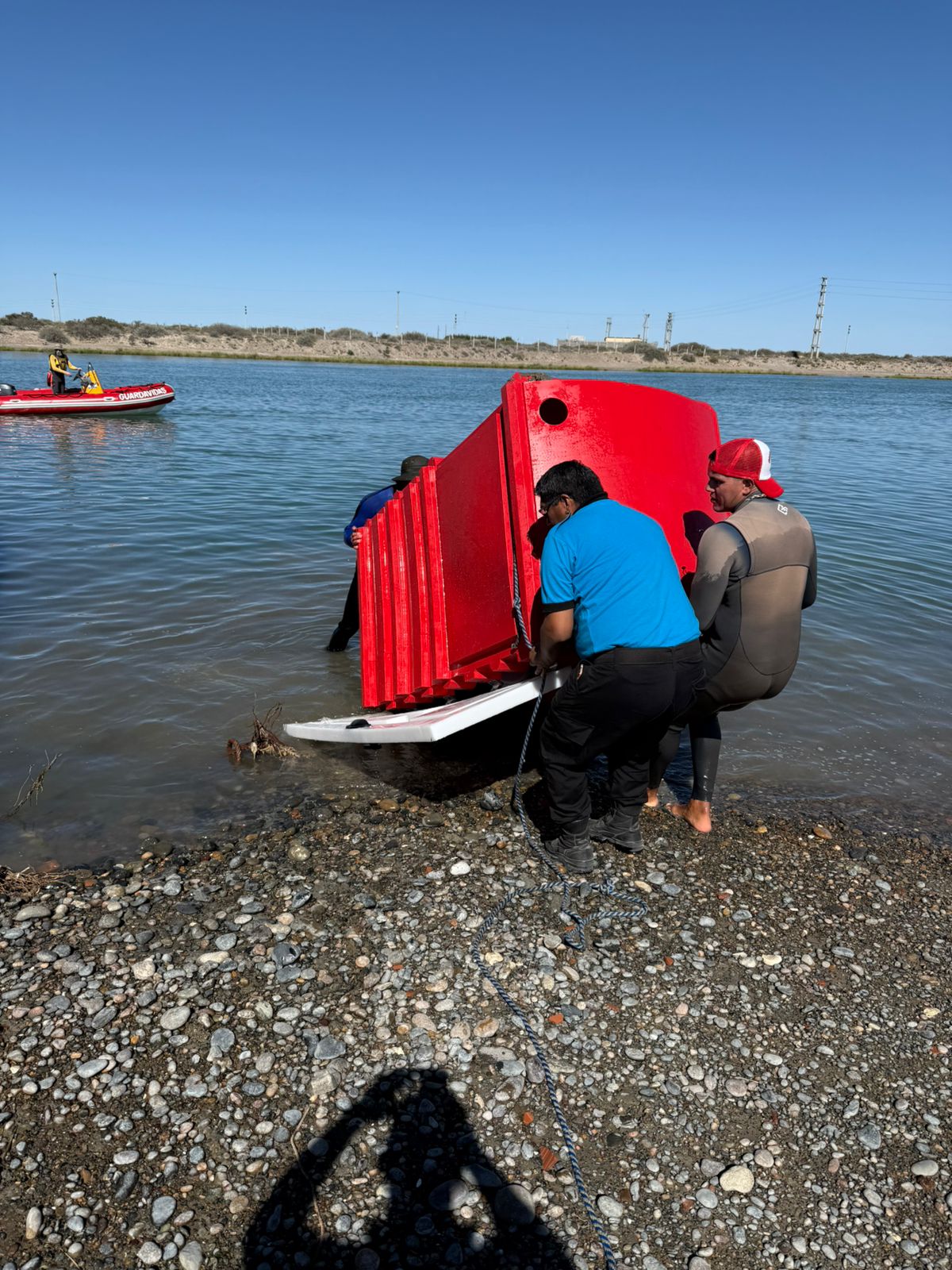 Como uno de los baños estaba flotando en el río, se convocó a integrantes del cuerpo de guardavidas, quienes concurrieron con una embarcación tipo semirrígido para recuperarlo de las aguas.