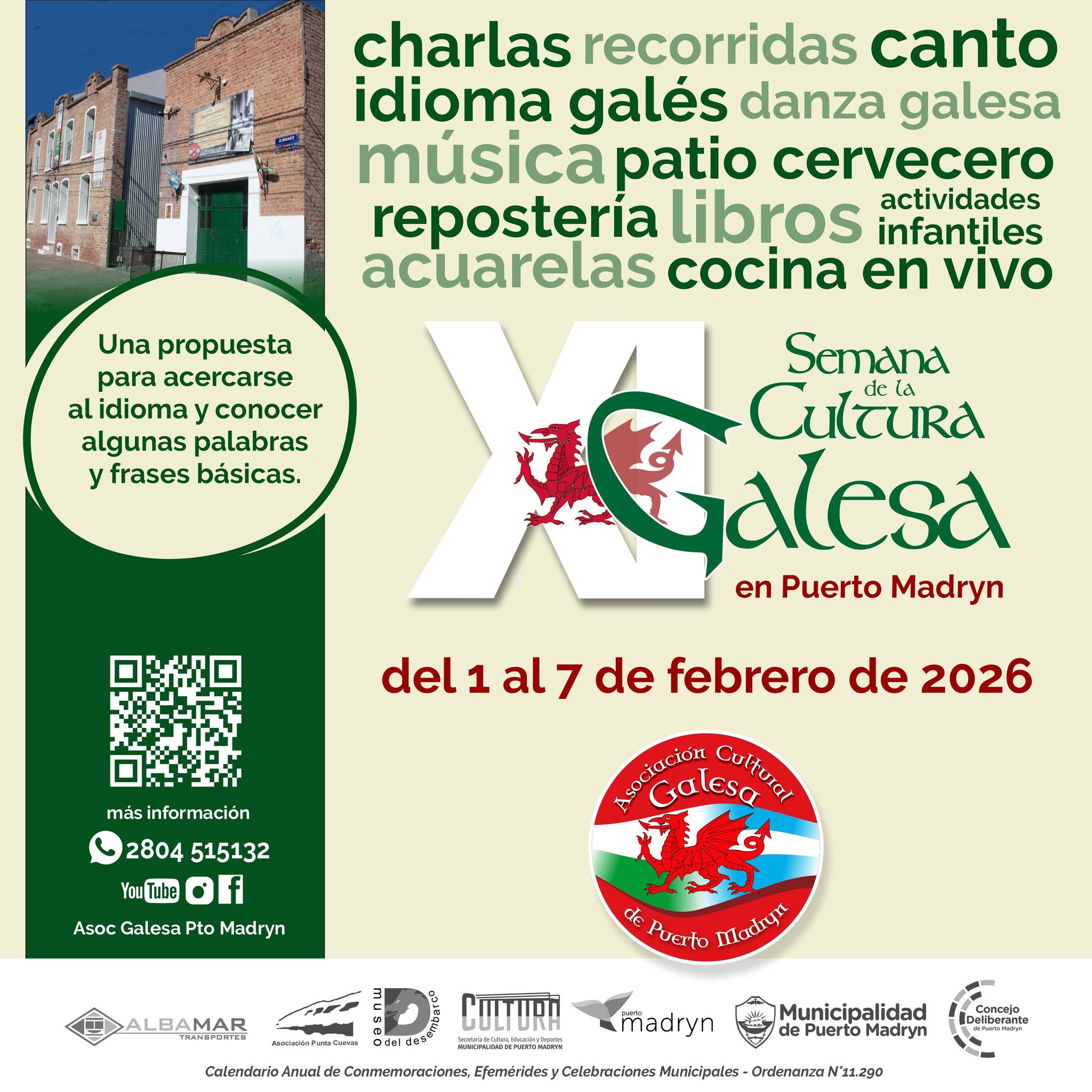 La Asociación Cultural Galesa de Puerto Madryn anunció la XI Semana De La Cultura Galesa En Puerto Madryn que se realizará del domingo 1 al sábado 7 de febrero con un amplio programa de actividades culturales, en su gran mayoría gratuitas, desarrolladas en la sede de la Asociación Cultural Galesa (Domecq García norte 241).