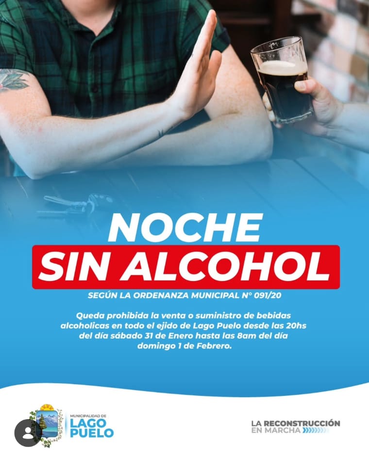 En sus redes sociales, la Municipalidad de Lago Puelo recordó a vecinos y turistas que se encuentra vigente la Ordenanza N°091/20, la cual establece “Una noche sin alcohol”. Se realiza el último sábado de enero, por lo que este año tendrá lugar el sábado 31 de enero.
