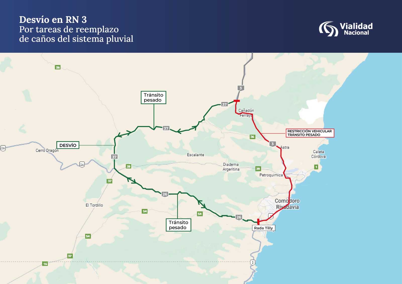 Vialidad Nacional, a través del 13° Distrito Chubut, informa que a partir de este sábado, a partir de las 20 h, comenzarán las tareas de reemplazo de caños del sistema pluvial que se encuentra a la altura del km 1833 de la RN 3. Por tal motivo, se aplicará una restricción de circulación para vehículos pesados, los cuales no podrán ingresar a la ciudad petrolera y deberán transitar por la Ruta Provincial 37 y RN 26, en sentido norte-sur y viceversa.