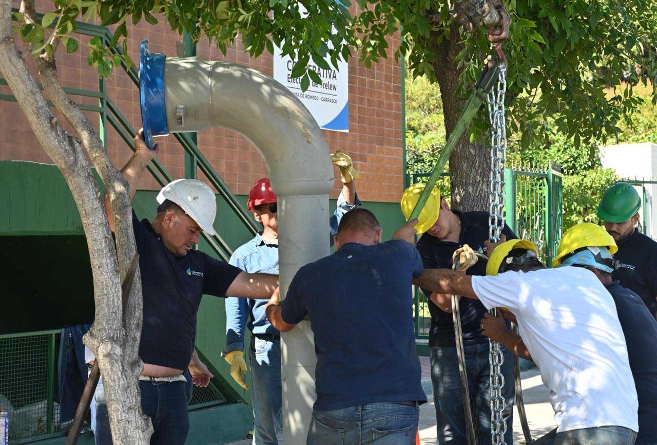 Operarios y equipos técnicos de la Cooperativa Eléctrica de Trelew trabajan desde este sábado muy temprano, para cambiar el colector dañado en la planta de tratamientos cloacales. Para realizar ese trabajo se tuvo que realizar un bypass del colector cloacal dañado, desde la Planta de Impulsión ubicada en Carrasco y Moreno hasta la intersección de Yrigoyen y José Hernández.