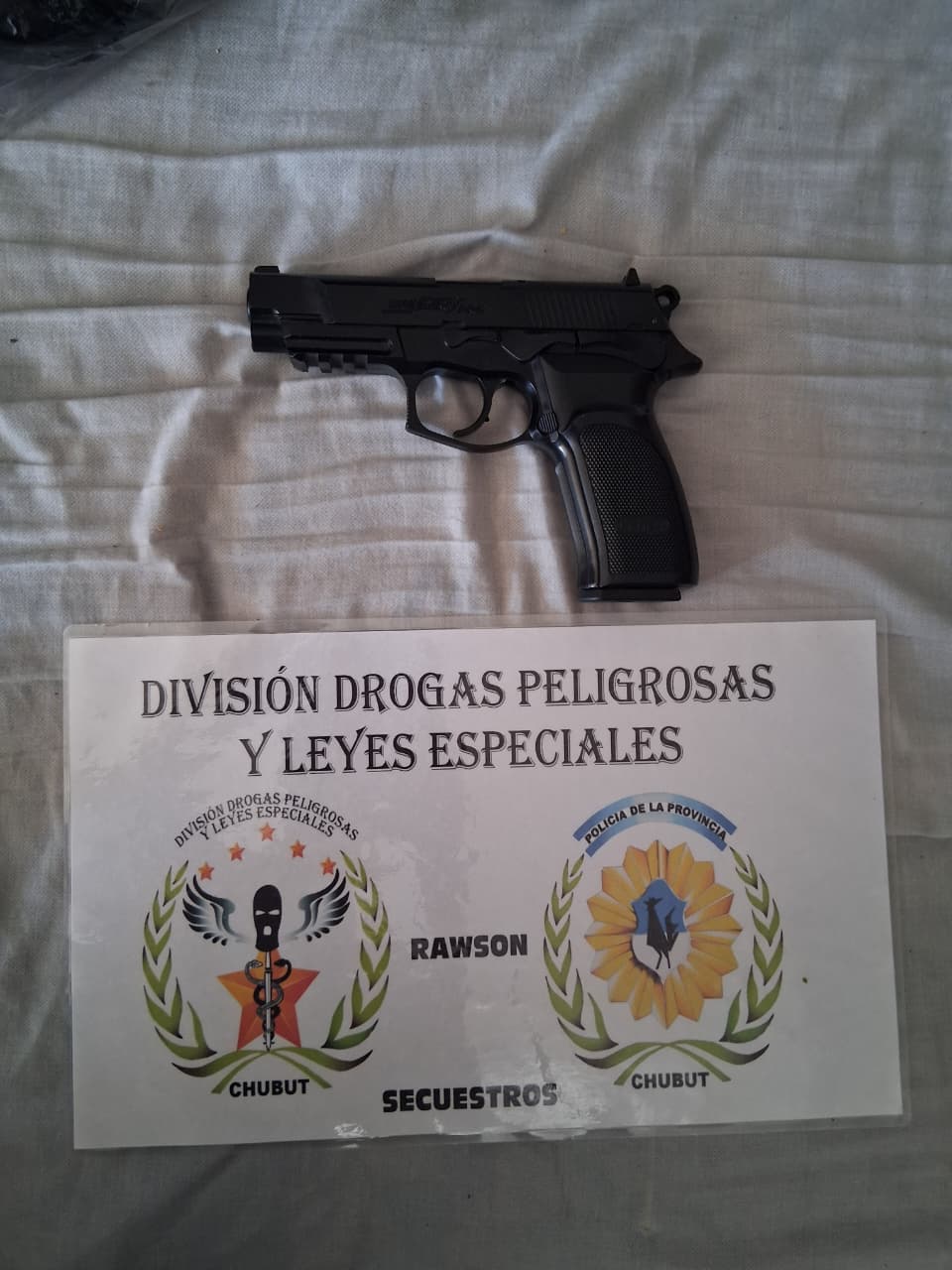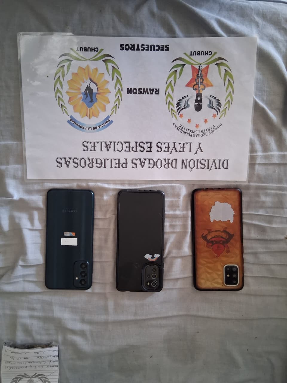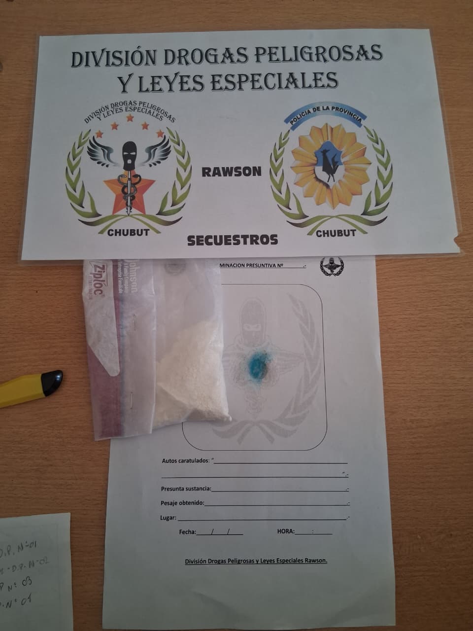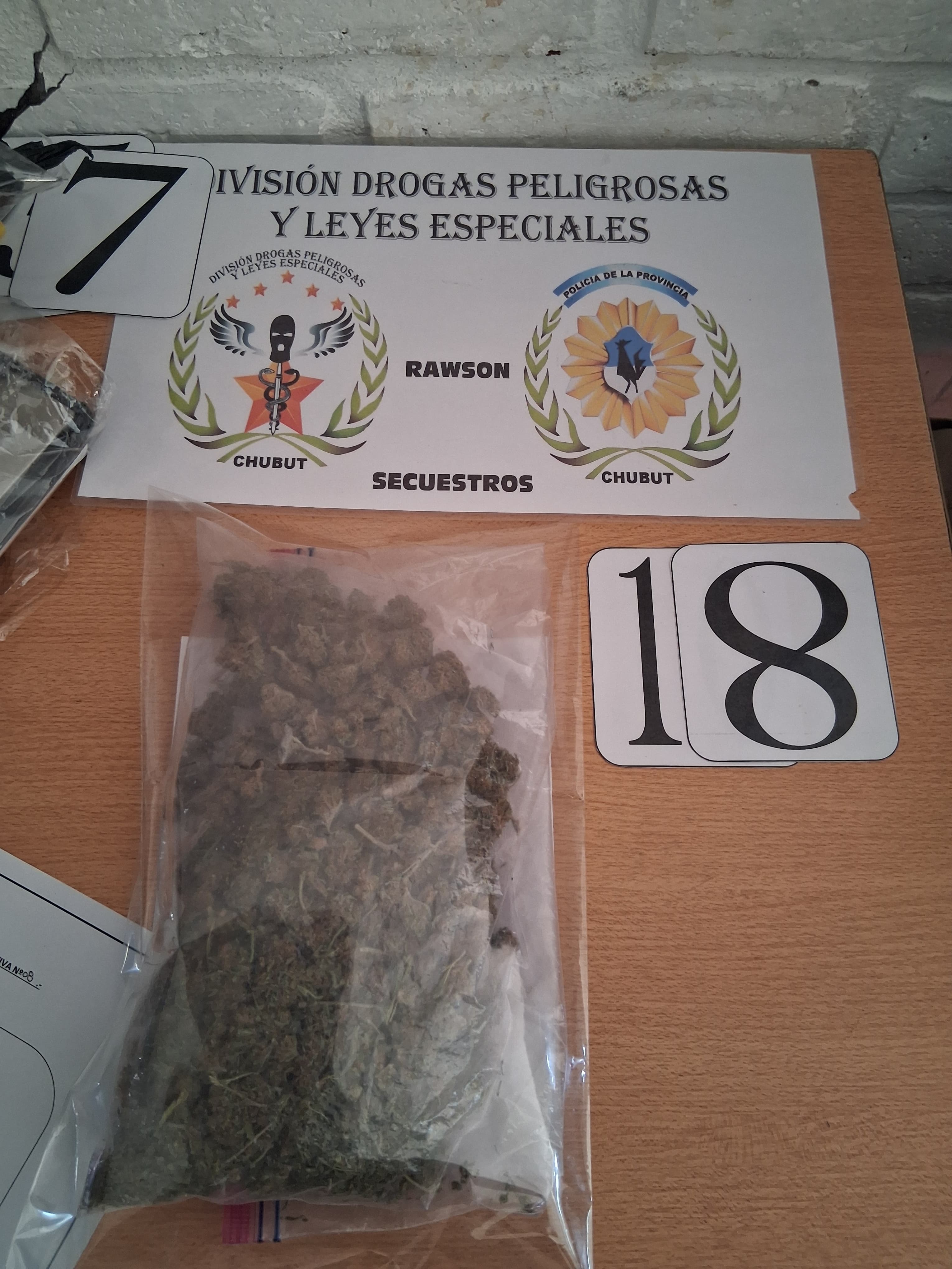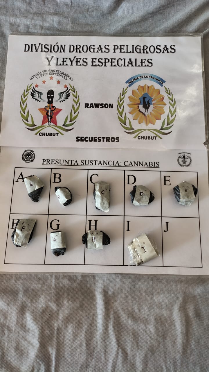 El procedimiento fue desarrollado con el personal de la División Drogas Rawson a cargo del comisario Cristóbal Mauricio Ramos y colaboración del Grupo Antinarcóticos de la misma ciudad. Supervisó la diligencia el comisario mayor Javier Soto, jefe del Área Drogas Peligrosas y Leyes Especiales.