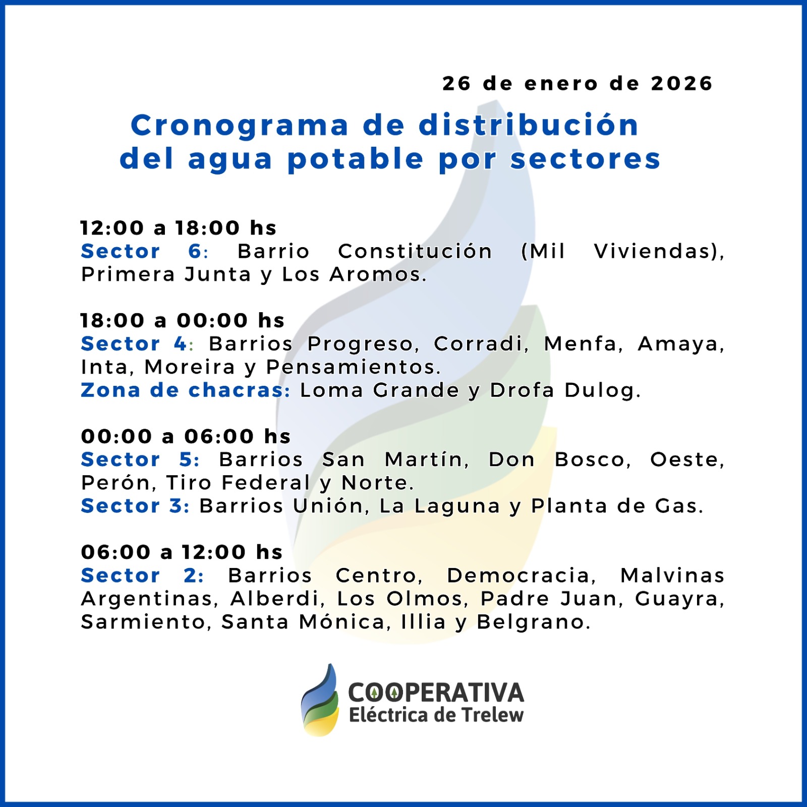 Fuentes de la Cooperativa Eléctrica de Trelew confirmaron a Jornada que la interrupción del servicio en principio previstopor 72 horas, continuará y aún no tienen la fecha exacta. Se indicó que surgieron inconvenientes para reparar una cañería dañada en calle Lezana y hasta este lunes no llegaban a dar con la rotura. Desde las 12 del mediodía comenzó el esquema y se habilitó en el sector 6: 1000 viviendas y Los Aromos.