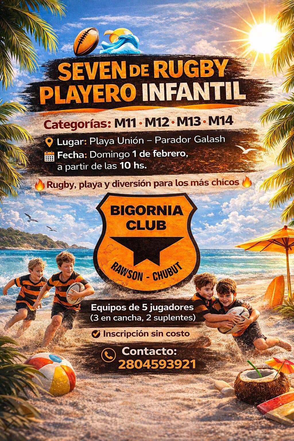 Con la organización de Bigornia Club de Rawson, el próximo domingo 1 de febrero se llevará a cabo elSeven Playero de rugby infantil.
