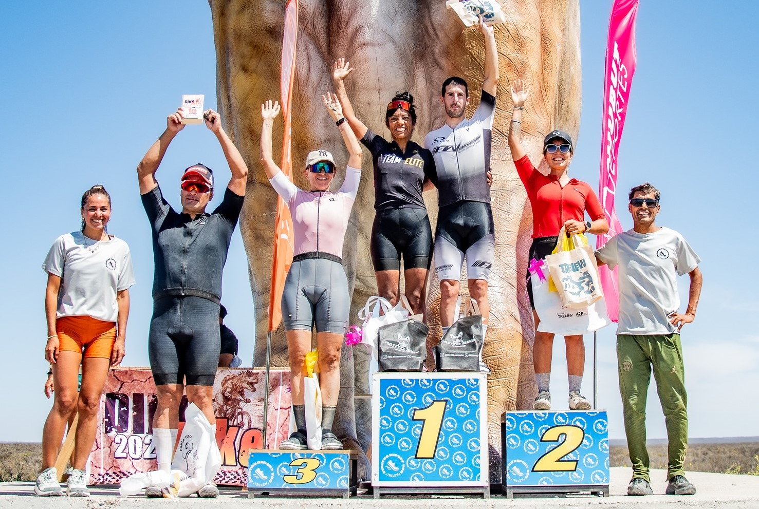 Con más de un centenar de pedalistas, la prueba tuvo como epicentro la réplica del dinosaurio Patagotitan en el acceso norte de Trelew, y tuvo dos distancias: 20km promocional y 40km competitiva.