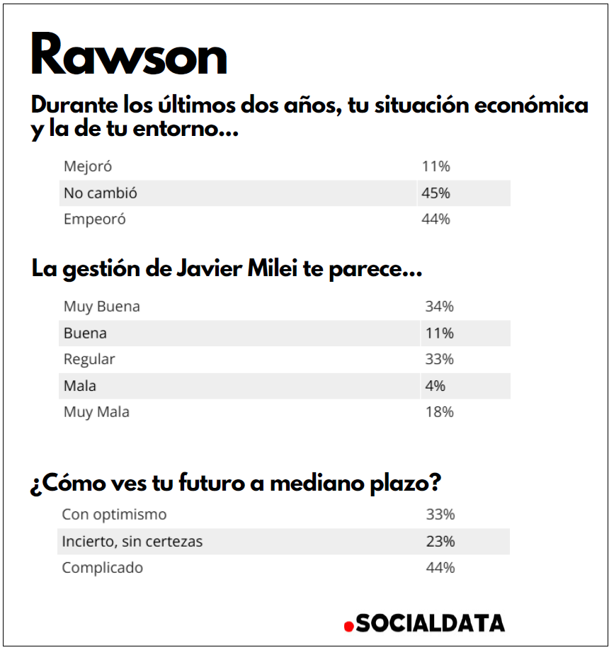 La evaluación de la gestión provincial de Nacho Torres se concentra mayoritariamente en la categoría regular. En tanto, la gestión municipal de Rawson muestra un balance desfavorable. Predominan claramente las respuestas que indican que no cumple con las expectativas, mientras que una porción minoritaria de los vecinos expresa conformidad con la administración local, indica el informe de SocialData.