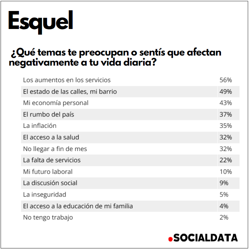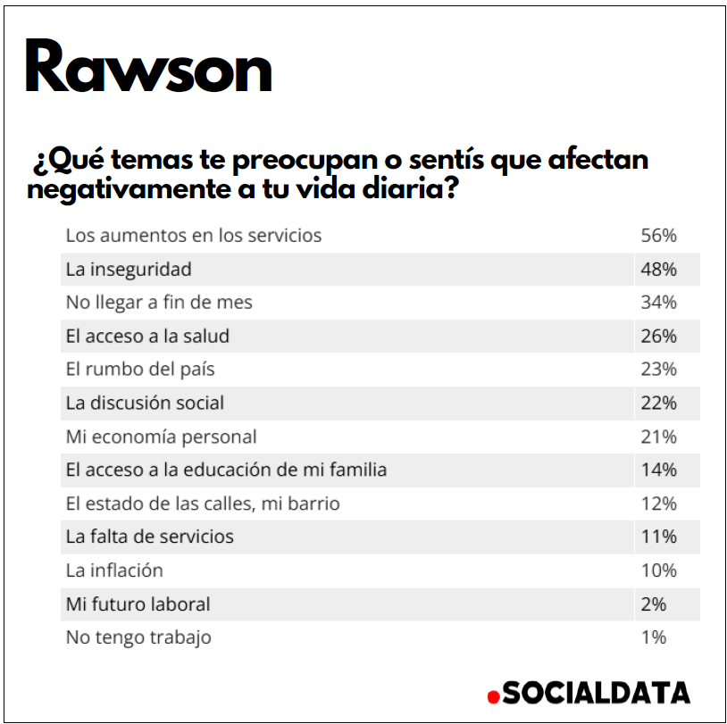Entre las principales preocupaciones que afectan la vida diaria, se destacan los aumentos en tarifas y servicios (56%), seguidos por la inseguridad (48%) y la dificultad de no llegar a fin de mes (34%).