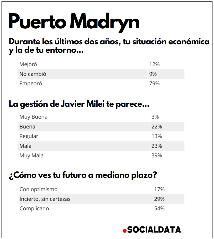 En cuanto al futuro, el clima es mayormente pesimista: el 83% de los madrynenses cree que su situación a mediano plazo será incierta, sin certezas y complicada, mientras que solo el 17% expresa expectativas optimistas.