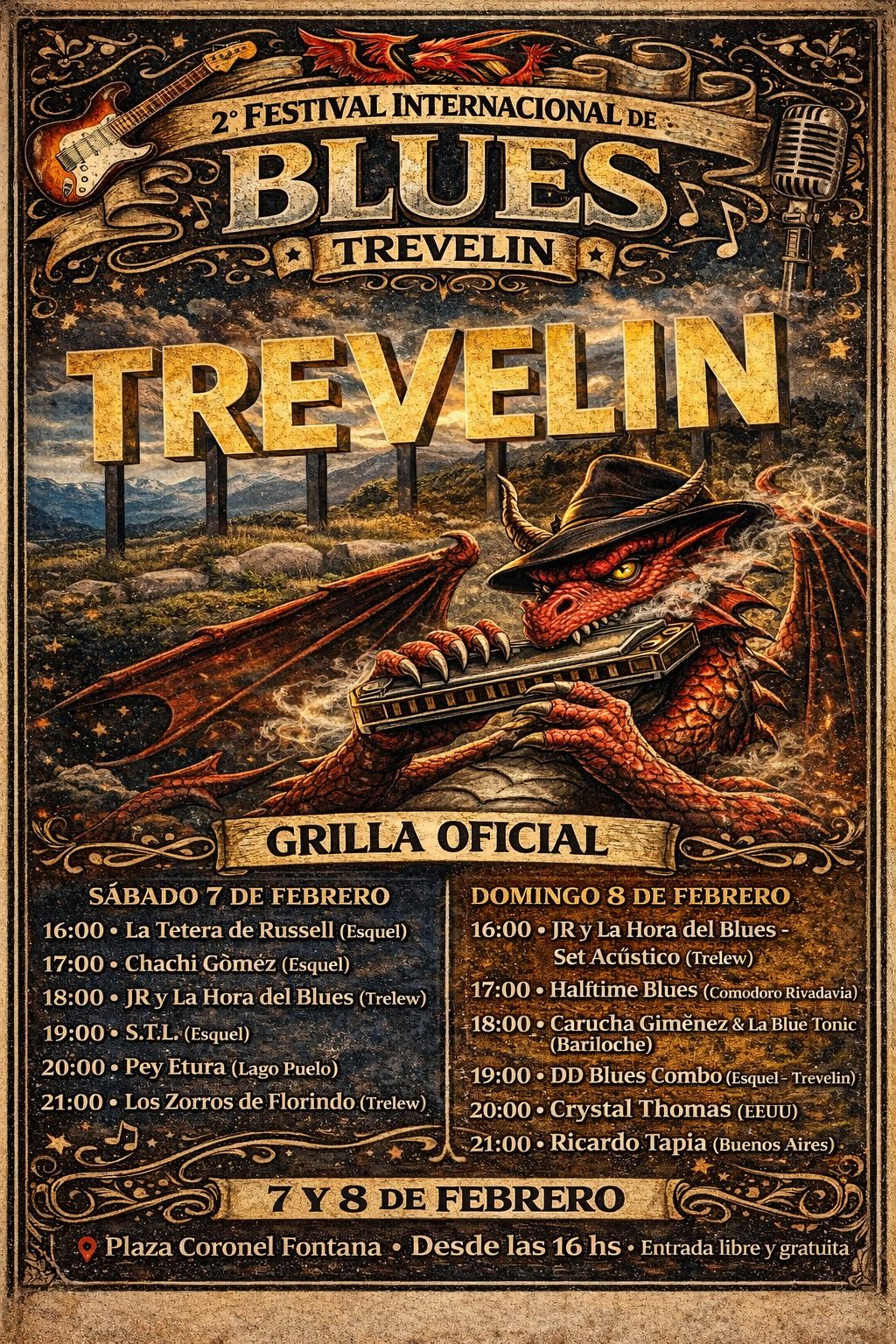 El 2° Festival Internacional de Blues Trevelin – Patagonia Argentina se realizará el sábado 7 y domingo 8 de febrero, a partir de las 16 horas, en la Plaza Coronel Fontana, con entrada libre y gratuita. El evento tendrá un marcado carácter solidario, ya que será a beneficio de los Bomberos Voluntarios de Trevelin, con el objetivo de colaborar en la adquisición de un camión de ataque para incendios forestales, en un contexto regional atravesado por los incendios.