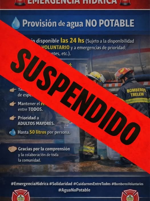 Los Bomberos Voluntarios de Trelew, y ante la seguidilla de incendios de pastizales, se vieron en la obligación de suspender este jueves y viernes, la entrega de agua a diversas instituciones en medio de la emergencia hídrica para priorizar la seguridad de la comunidad.