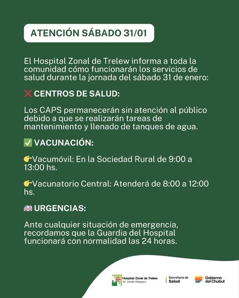 El Hospital Zonal de Trelew informó a toda la comunidad cómo funcionarán los servicios de salud durante la jornada del sábado 31 de enero: Centros de Salud Cerrados y los CAPS permanecerán sin atención al público debido a que se realizarán tareas de mantenimiento y llenado de tanques de agua.