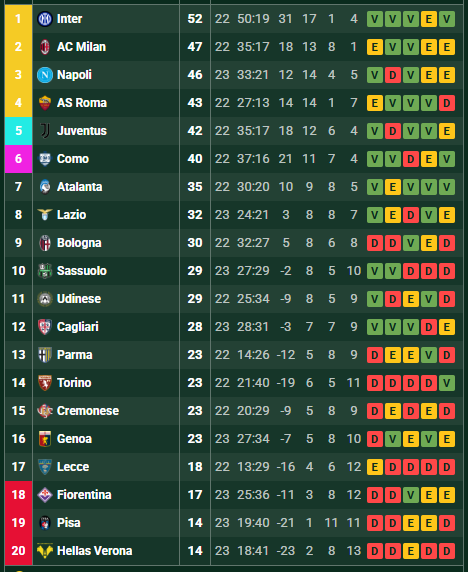 A última hora, Cagliari goleó al Hellas Verona por 4 a 0 como local en Cerdeña. Mazzitelli, Kiliçsoy, Sulemana eIdrissi conviertieron los goles. El visitante acabó con 10 por expulsión de Sarr. El vencedor está en mitad de tabla, mientras queel Verona está a 4 puntos de salvación.