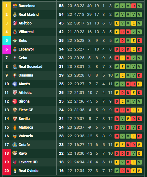 Por otro lado, Rayo Vallecano-Real Oviedo, por el mal estado del campo de juego,y Sevilla-Girona, debido a la alerta naranja,fueron aplazados.
