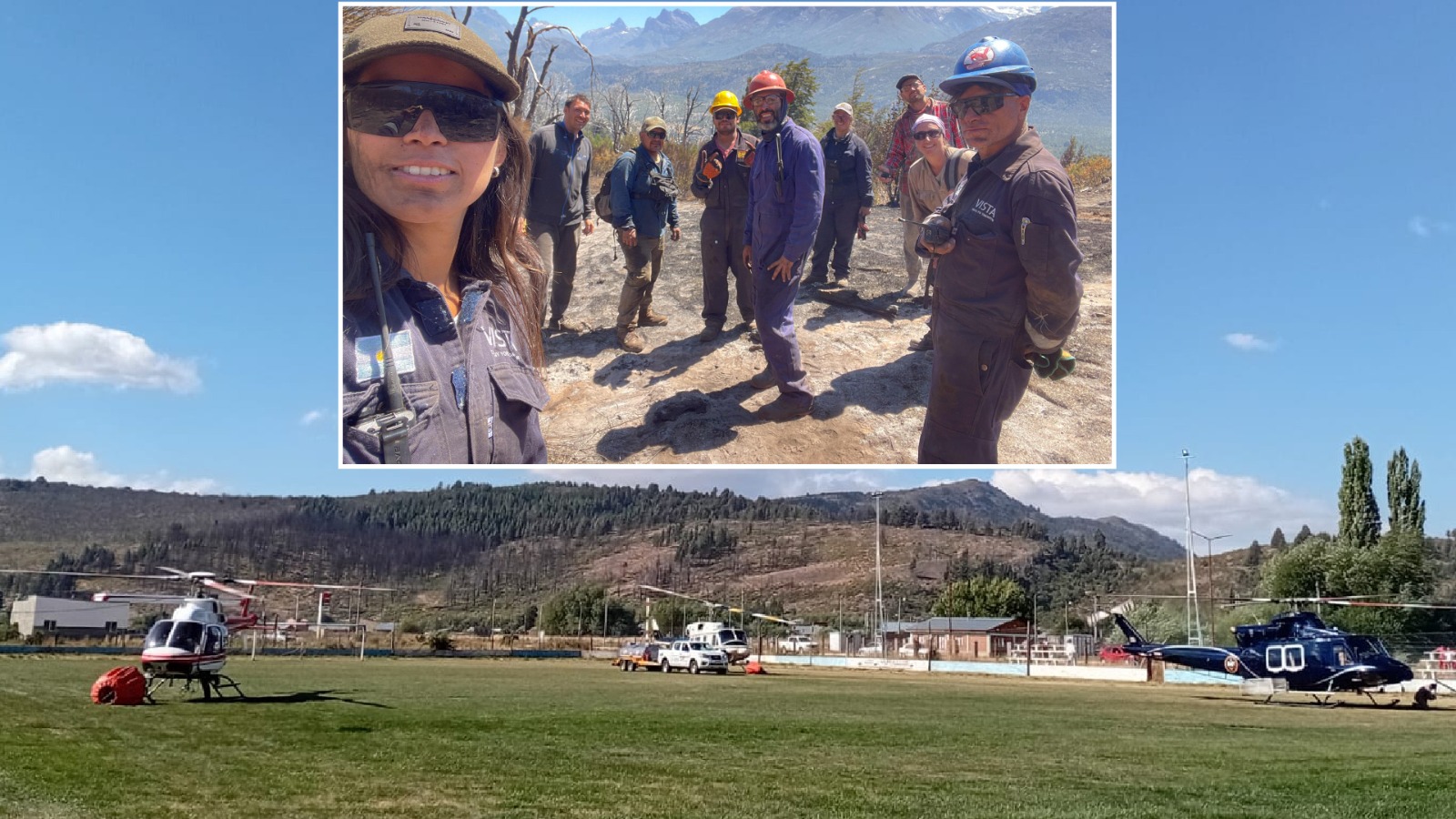 Así, el verde césped cholilero se volvió punto estratégico. Tres helicópteros operan desde allí: por la mañana trasladan brigadistas a las zonas críticas y luego regresan para cargar el helibalde, reabastecer combustible y volver al combate. El club sostiene esa logística indispensable.
