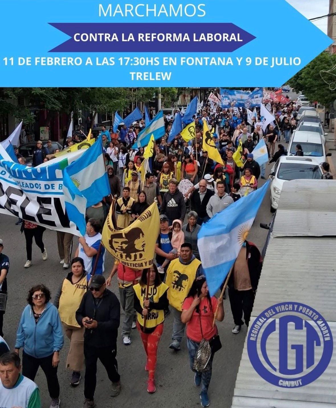 Este martes, desde las 17:30 en Fontana y 9 de Julio, se marchará por las calles de Trelew en contra de la reforma laboral. Lo mismo sucederá en la ciudad de Puerto Madryn desde las 18, la concentración será en la Plaza San Martín.