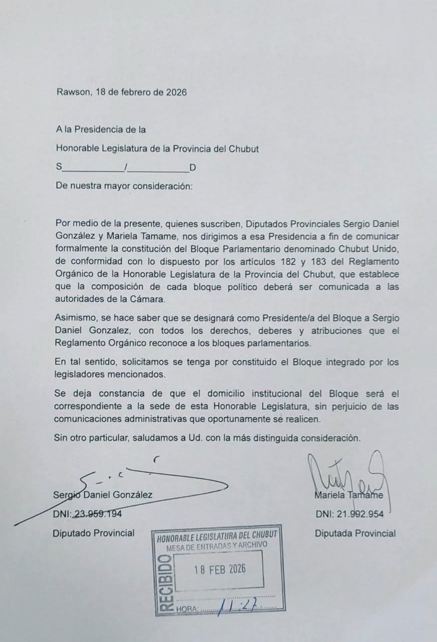 Los diputados provinciales Sergio González y Mariela Tamame comunicaron a la Presidencia de la Legislatura su decisión de conformar un bloque propio que denominaron “Chubut Unido”, cuya presidencia ejerce González.
