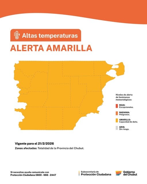 La Subsecretaría de Protección Ciudadana del Gobierno del Chubut reiteró este sábado que Chubut se encuentra bajo “alerta amarilla” Alerta amarilla por altas temperaturas, prevista para este 21 de febrero.