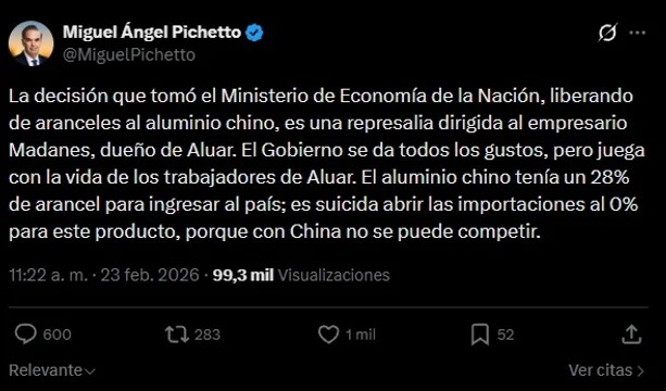 “La decisión que tomó el Ministerio de Economía de la Nación, liberando de aranceles al aluminio chino, es una represalia dirigida al empresario Madanes, dueño de Aluar.