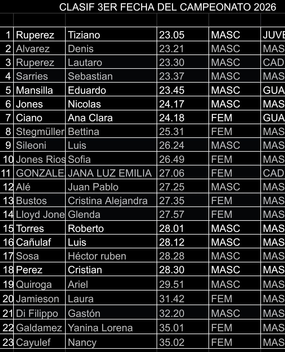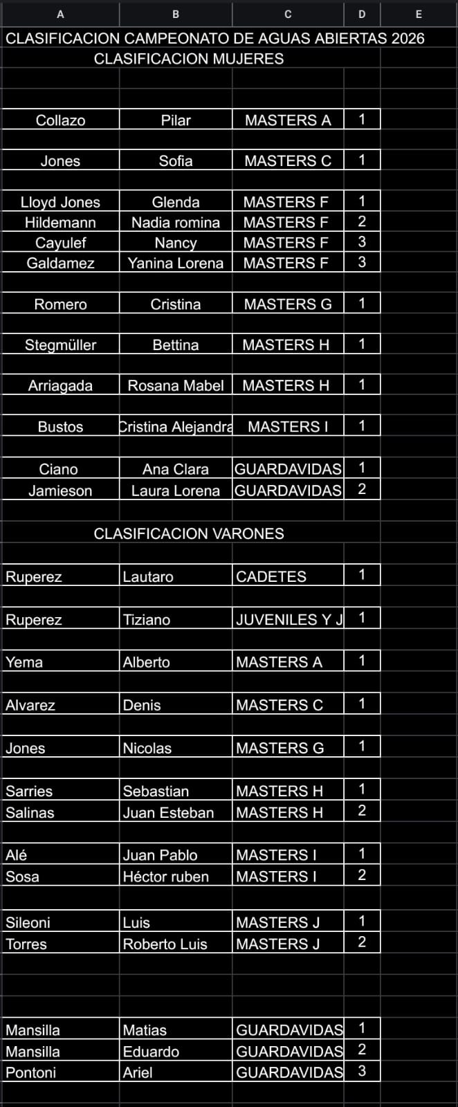 La última fecha también como tuvo como ganadores a Denis Álvarez en Master “C”; el menor de los Rupérez, Lautaro, en Cadetes; Sebastián “Reo” Sarries en Master “H”, Eduardo “Junior” Mansilla en Guardavidas varones, Nicolás Jones en Master “G”, Bettina Stegmuller en Master “H” femenino, Luis Sileoni en Master “J”, Sofía Jones en Master “C”, Jana González en Cadetes mujeres, Juan Pablo Ale y Cristina Bustos en Master “I”, Glenda Lloyd Jones en Master “F”, Luis Cañulaf en Master “D” y Laura Jamieson en Master “B”.