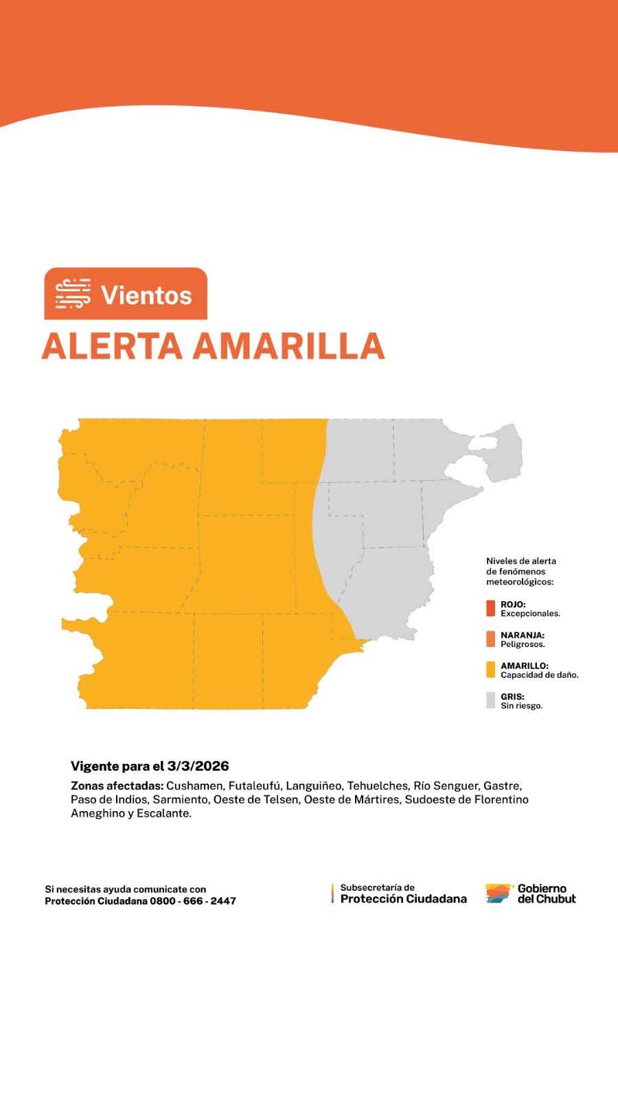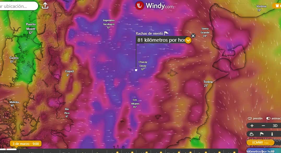 La alerta amarilla por viento abarca meseta, centro de Chubut, precordillera y cordillera, especialmente en el oeste. Según el Servicio Meteorológico Nacional, los vientos del sector oeste podrían alcanzar entre 40 y 65 km/h, con ráfagas que superarían los 90 km/h, lo que genera complicaciones para la circulación y actividades al aire libre.