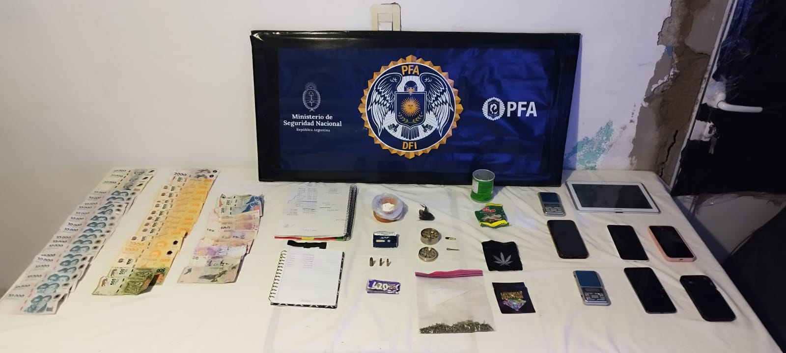 También se desmanteló un indoor acondicionado para el cultivo de marihuana y se incautaron teléfonos celulares, una importante suma de dinero en efectivo, una balanza de precisión, elementos de corte, anotaciones y documentación de interés para la causa.