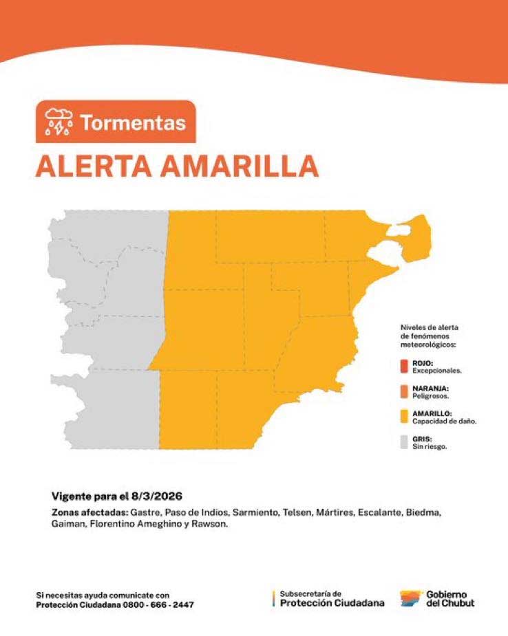 Recordemos que el SMN lanzo una alerta amarilla por lluvias intensa que comienzan este sábado, intermitentemente, y tendrán su mayor actividad durante el día domingo, abarcando todo el centro y este de Chubut.