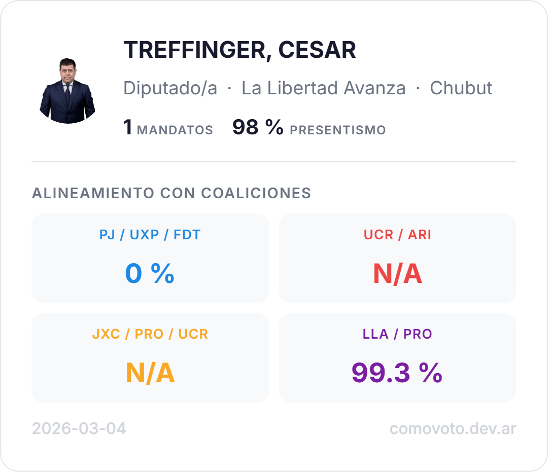 Treffinger, en tanto, con un mandato más extenso (está desde diciembre de 2023), suma 98% de presentismo y 99,3% de apoyo a proyectos de LLA. Nunca votó nada que no haya salido de la agenda parlamentaria de Milei.