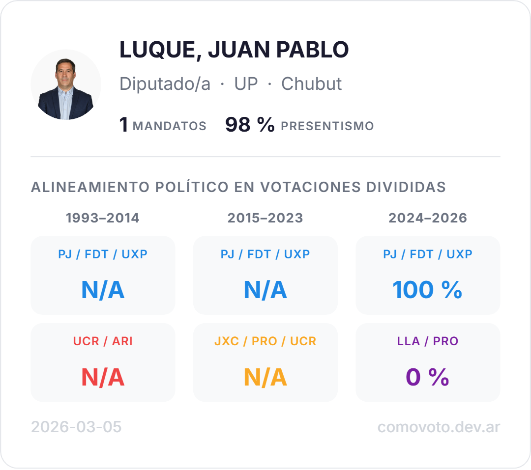 Entre los peronistas también hay disciplina ideológica: el comodorense José Glinski registra 99% de presentismo y 99,6% de coincidencia con leyes impulsadas por PJ/UxP/FdT, sin alineamiento con LLA/PRO. Mientras que el comodorense Juan Pablo Luque, asumido en diciembre pasado, tiene 98% de asistencia y 100% de alineamiento a las votaciones del peronismo.