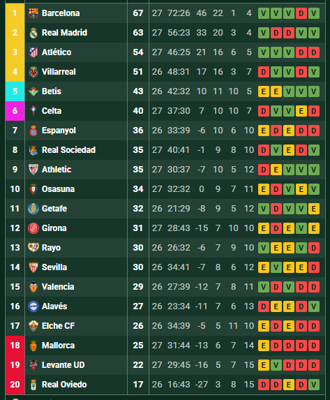 En tanto, y en los otros cotejos jugados este sábabdo, Atlético Madrid superó a Real Sociedad por 3 a 2, mientras que Osasuna igualó con Mallorca 2 a 2 y Levante empató frente a Girona 1-1.