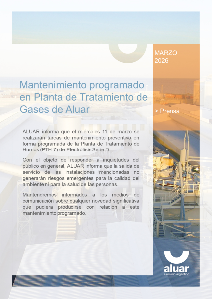 Prensa ALUAR informa que el miércoles 11 de marzo se realizarán tareas de mantenimiento preventivo en forma programada de la Planta de Tratamiento de Humos (PTH 7) de Electrólisis Serie D.