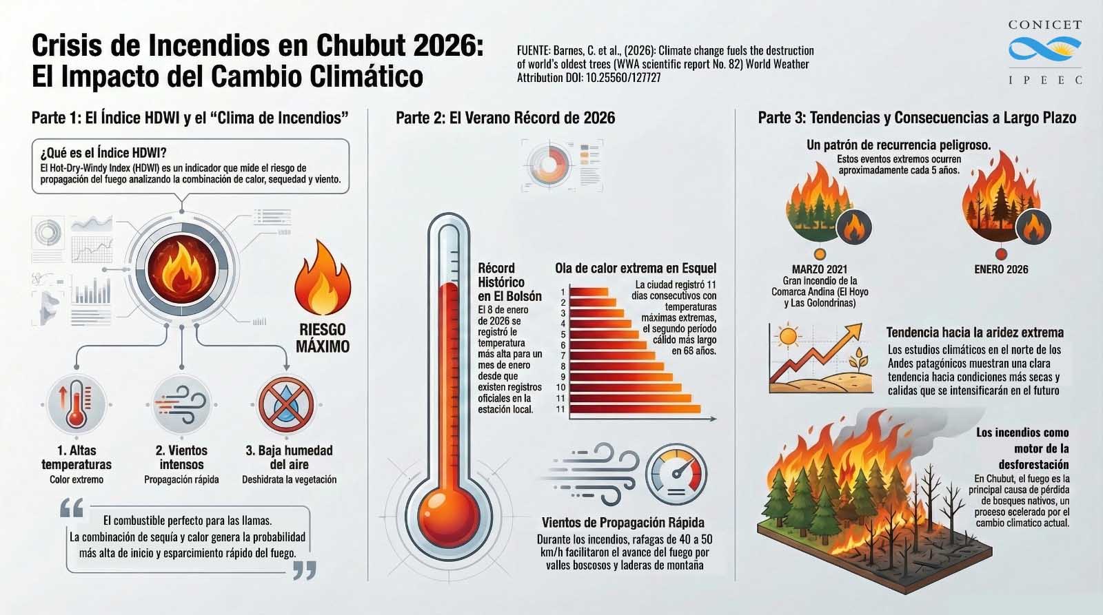 El fuego que este verano avanzó sobre bosques milenarios en la Patagonia no fue solo una tragedia ambiental: también es una señal del cambio climático en acción. Una investigadora del CONICET con sede en Puerto Madryn participó en un informe científico internacional que analizó las condiciones climáticas que favorecieron los incendios del verano de 2026 en Argentina y Chile.