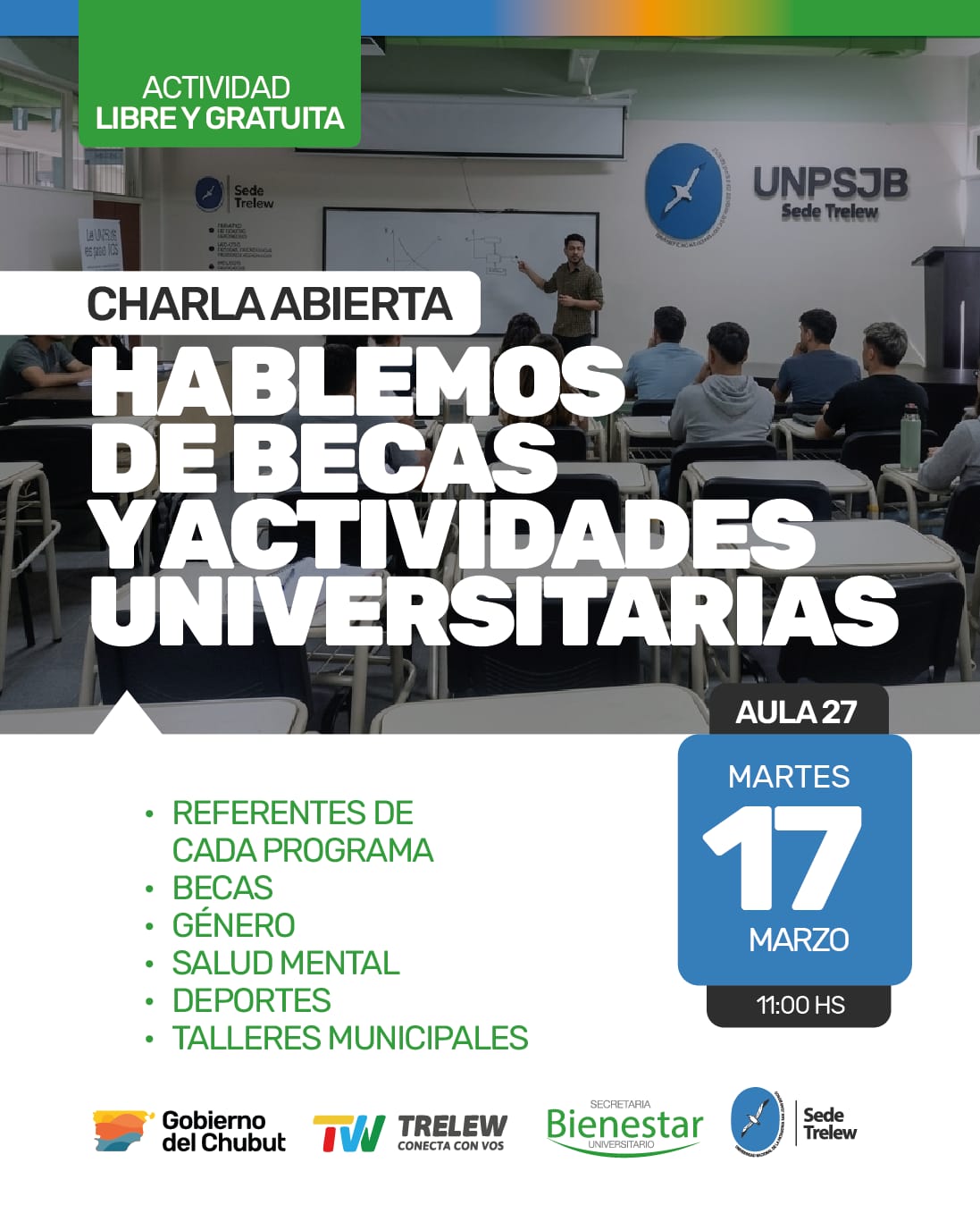 El próximo martes 17 de marzo a partir de las 11 en el aula 27 del Edificio de aulas de la UNPSJB, sita en 9 de Julio y Belgrano de la ciudad de Trelew, se realizará una Charla Abierta para todas las personas interesadas en asesorarse sobre Becas Universitarias: (Becas de la Universidad Nacional de la Patagonia San Juan Bosco, Beca del Ministerio de Educación de la Provincia del Chubut, Beca Progresar, Transporte gratuito – Bech, talleres culturales y clases de apoyo de la Municipalidad de Trelew.