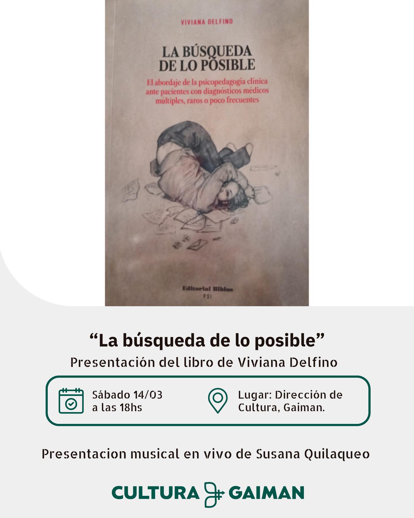 Este sábado 14 de marzo, a las 18 horas, en la Dirección de Cultura de Gaiman, se realizará la presentación del libro “La búsqueda de lo posible” de Viviana Delfino.El libro desarrolla el abordaje de la psicopedagogía clínica ante pacientes con diagnósticos médicos múltiples, raros o poco frecuentes.