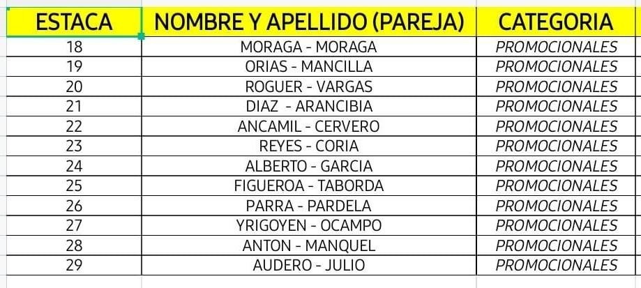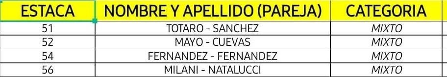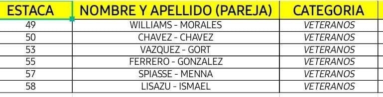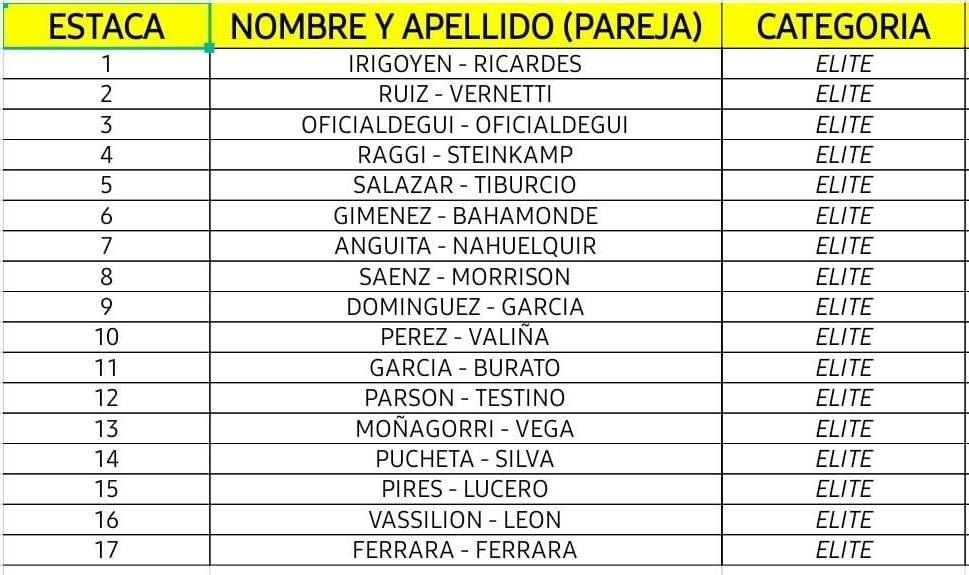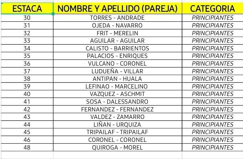 Las 17 parejas de la categoría Elite estarán bien al sur y hacia El Sombrerito se ubicarán las 12 de Promocionales, las 18 de Principiantes y entremezcladas, las seis de Veteranos y los cuatro binomios de Mixtos.