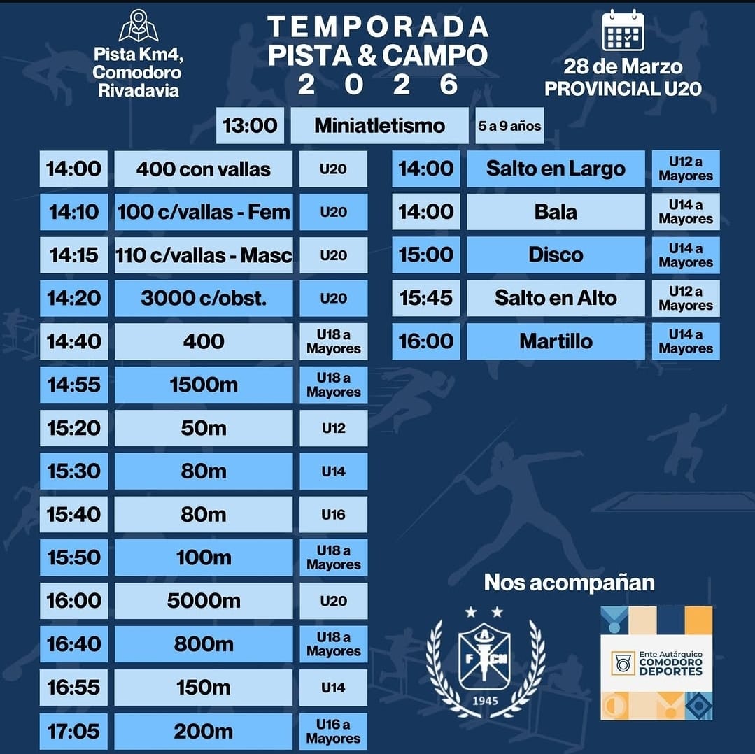 En cuanto al cronograma del sábado la actividad comenzará a las 13 para el miniatletismo y a partir de las 14 se realizará el Provincial. De hecho los 400 metros con vallas para U20 será la primera prueba de la jornada que se extenderá hasta alrededor de las 17.30.