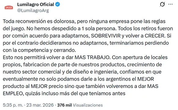 Y añadió: "Esto nos permitirá volver a dar más trabajo. Con la apertura de locales propios, la fabricación de parte de nuestros productos y el crecimiento de nuestro sector comercial y de diseño e ingeniería, confiamos en que eventualmente no solo podamos darle a los argentinos el mejor producto al mejor precio, sino que también volveremos a generar más empleo, quizás incluso más del que teníamos antes".