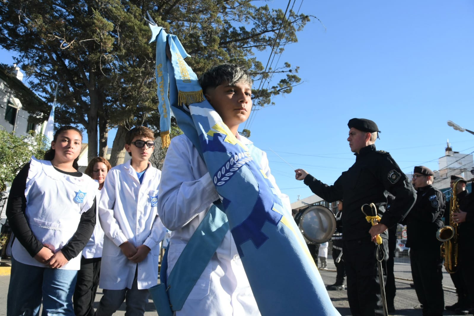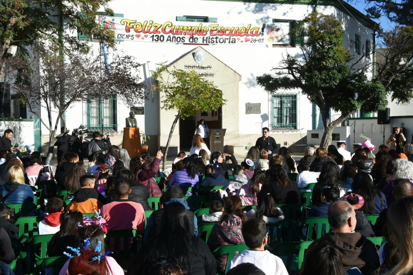 La Escuela Provincial N º 5 “Domingo Faustino Sarmiento”, este jueves celebró su 130 º aniversario. Con un corte de calle, se realizó un gran acto en el frente de la institución. Participaron alumnos, exalumnos, familias, personal educativo, el intendente Gerardo Merino y funcionarios municipales. Musicalizó el acto, la Banda de la Policía del Chubut.