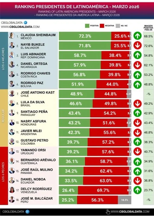 Por otro lado, los peores rankeados son José María Balcázar (Perú) en el último lugar, con apenas 25,2% de aprobación, seguido por Delcy Rodríguez (Venezuela), con 26,4%, y Daniel Noboa (Ecuador), con 33,5%.
