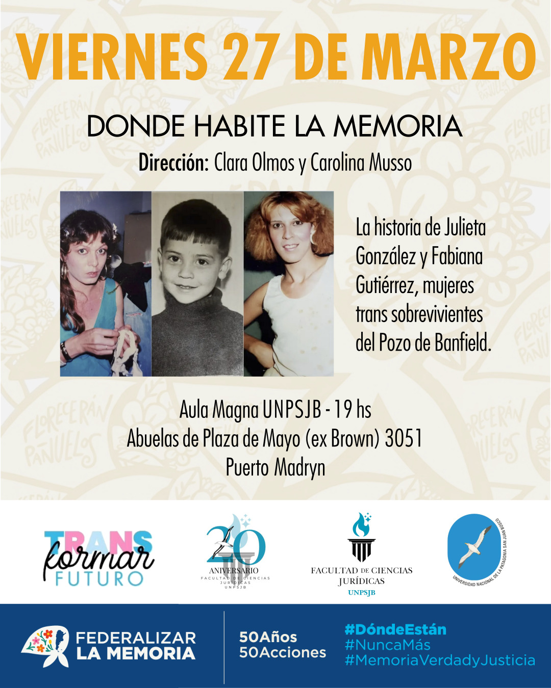Este viernes 27 de marzo en el aula magna de la Universidad Nacional de la Patagonia San Juan Bosco de Puerto Madryn, a las 19 horas, se proyectará el documental “Donde habite la memoria” dirigido por Clara Olmos y Carolina Musso.